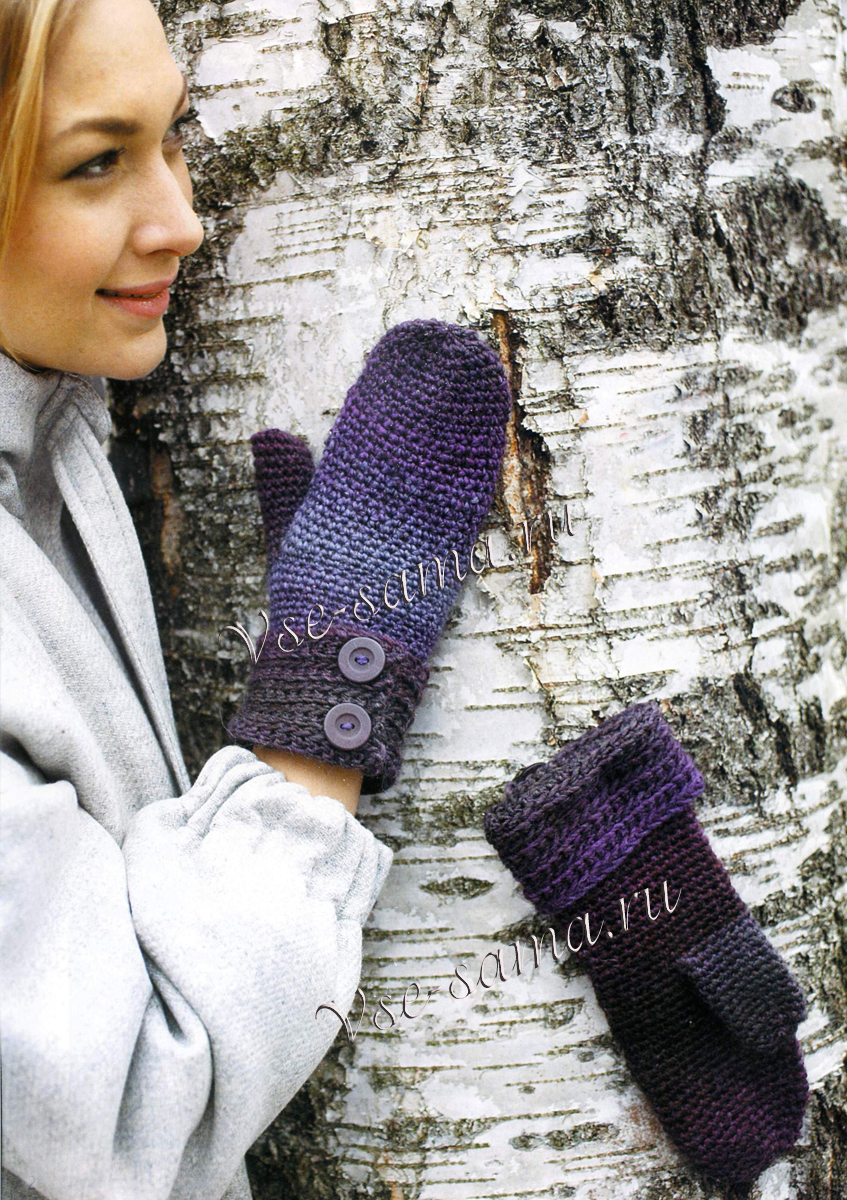 Фиолетовые варежки с пуговицами Дизайн: Minna Metsanen Размеры: детский - рост 150 см (женский) мужской Вам потребуется: пряжа Novita Usva (75% шерсть, 25% полиамид, 140 м/100 г) - 100(150)150 г меланжевой в фиолетовых тонах (898), крючок №5, 4 пуговицы. Плотность вязания: 15 ст б/н = 10 см. Описание вязания фиолетовых варежек с пуговицами Левая варежка: Крючком наберите цепочку из 34(38)44 возд. п. Наберите 1 возд. п. подъема, поверните работу и провяжите 34(38)44 ст б/н. Продолжайте вязать прямыми и обратными рядами столбиками б/н, набирая в конце каждого ряда 1 возд. п. для подъема. 1-й ряд (изнаночная сторона работы) - вяжите ст. б/н за передние стенки. 2-й ряд— (лицевая сторона работы) - вяжите ст б/н за задние стенки. Повторите 1-2-й ряды 4(5)5 раз (высота манжеты -примерно 6(7)7 см). Затем сомкните получившуюся полоску в кольцо так, чтобы левая сторона заходила на правую сторону на 8 ст Затем провяжите ст б/н по верхнему краю, провязывая в месте перекрытия по 2 ст каждой стороны = 26(30)36 ст Далее вяжите вкруговую столбиками б/н до высоты ладони 15(17)18 см. Затем отметьте место для вывязывания большого пальца, учитывая, что пуговицы должны быть с тыльной стороны справа: для большого пальца отметьте булавкой или контрастной нитью 2 см слева от сгиба с внутренней стороны ладони. В следующем ряду пропустите это место, набрав над ним 6(7)8 возд. п. Продолжайте вязать по кругу ст б/н до высоты 9(10)12 см от большого пальца или пока не закроется указательный палец. В следующем ряду равномерно убавьте 2 ст = 24(30)36 ст Затем начинайте выполнять убавления для формирования мыска варежки: 1-й ряд - вяжите *4 ст б/н, 2 ст б/н вместе* повторяйте * * = 20(25)30 ст Провяжите 1 ряд без убавлений. 2-й ряд - вяжите *3 ст б/н, 2 ст б/н вместе* повторяйте * * = 16(20)24 ст Провяжите 1 ряд без убавлений. 3-й ряд - вяжите все столбики по 2 ст б/н вместе. Только для мужского размера: провяжите еще 1 ряд, провязывая все столбики по 2 ст б/н вместе. Для всех размеров: обрежьте нить, стяните оставшиеся петли концом нити, закрепите нить. Для вывязывания большого пальца по краю отверстия равномерно провяжите 14(16)18 ст б/н. Вяжите по кругу столбиками б/н, пока не закроется половина ногтя. Обрежьте нить, стяните оставшиеся петли концом нити, закрепите нить. Сборка: Отпарьте готовые варежки. Пришейте пуговицы на манжеты, как показано на фото.